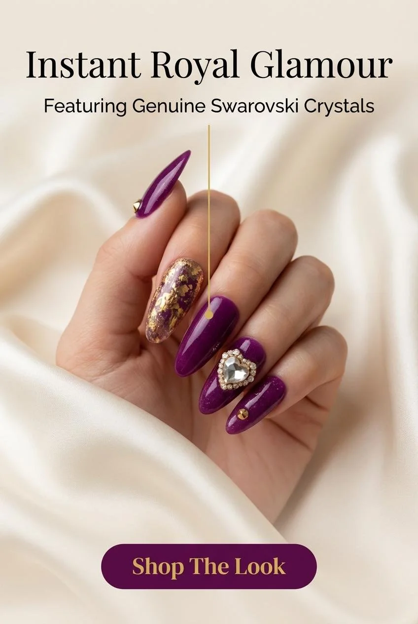 Royal Diva Press On Nails: Deep Purple Almond, Swarovski Crystal, Hand-Painted
